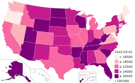 ![]() Случаи заражения по штатам США (на 100 тыс. жителей) | |