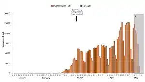 Тестирование на коронавирусную инфекцию COVID-19 в США началось ещё в январе, но оно шло медленно: к 28 февраля было проведено лишь 4 тысячи тестов[14][15]. К 20 марта было проведено 100 тысяч тестов[16]. Тесты начали проводить частные компании по всей стране[16].