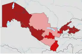 ![]() Уровень распространения COVID-19 в регионах Узбекистана на 5 мая 2020 года > 10000 случаев > 1000 случаев > 100 случаев > 10 случаев < 10 случаев | |
