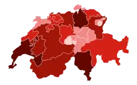 ![]() Карта Швейцарии в разрезе количества заражённых[1] 1-99 случаев 100-499 случаев 500-999 случаев 1,000-2,499 случаев 2,500+ случаев | |