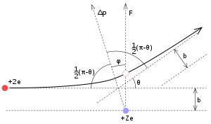 Зависимость между углом отклонения и прицельным расстоянием при рассеянии частицы даётся уравнениями:[3][4]: , где .