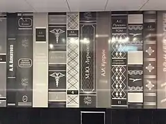 Архитектурная концепция совмещает декораторский стиль ар-деко и пространство классического читального зала общественной библиотеки. Главные элементы интерьера — колонны, задекорированные под «шкафы-картотеку». На лицевой поверхности картотечных ящиков нанесены QR-коды. Пол станции выполнен в виде ромбовидного шахматного рисунка двух типов гранита: тёмно-серый с белым и светло-серый с белым. Путевые стены облицованы металлокерамическими панелями с рисунком в виде корешков книг, а простенки со скамейками для отдыха, расположенные между колонн, — цитатами известных людей[24]. Станция освещается светильниками правильной геометрической формы, а освещение вдоль путей сделано скрытым. Основания колонн и названия станции на путевых стенах также получили архитектурную подсветку[1].