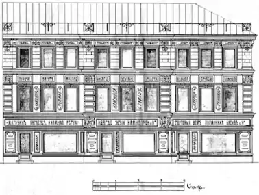 Современный вид здание получило в 1895 году, когда под руководством архитектора В. Г. Сретенского южный корпус перестроили из жилого помещения в трёхэтажный магазин. Арочные своды первого этажа были разобраны и заменены высокими потолками торговых залов; были обустроены лестницы, коробовые своды подвала уступили место армокаменным сводам по металлическим балкам. Фасад был переделан в модный тогда московский эклектический стиль. Здание украсила горизонтальная рустика, четыре вертикальных лопатки разделили здание на три равных части по три оконных оси, три тянутых профилированных карниза поместили над окнами каждого этажа, над окнами первого и второго этажей были размещены широкие стационарные ленты для рекламы. Два окна первого этажа каждой из трёх частей фасада были объединены в широкие витрины, а третье — обустроено под вход. Первый этаж занял магазин швейцарских золотых часов Л. В. Габю. По состоянию на 1914 год в доме также размещались аптека и склад В. К. Феррейна и книжная лавка В. И. Чумакова[6][5][1].
