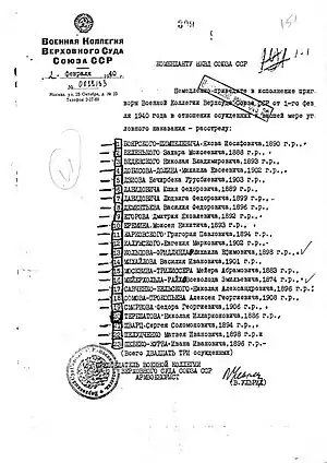 Всего известно 383 списка НКВД на 44 тысяч человек, на 39 тысяч из которых Политбюро дало санкцию на расстрел. Среди приговорённых Военной коллегией к расстрелу — писатели И. Э. Бабель, И. И. Катаев, Б. А. Пильняк, С. М. Третьяков, Б. Ясенский, М. Е. Кольцов, режиссёр В. Э. Мейерхольд, дипломаты М. Э. Плисецкий и А. Я. Аросев, маршалы М. Н. Тухачевский и А. И. Егоров, маршал авиации С. А. Худяков, учёные Н. Д. Кондратьев, Е. Д. Поливанов, Р. Л. Самойлович и А. В. Чаянов, члены политбюро Н. И. Бухарин, Г. Е. Зиновьев, Л. Б. Каменев, С. В. Косиор, А. И. Рыков, В. Я. Чубарь, а также правительство Монголии в полном составе, 25 союзных и 19 республиканских наркомов, 13 командармов, 43 комкора, 85 комбригов, свыше 100 профессоров, более 300 директоров ведущих предприятий и многие другие[19][21][10]. Происходящим в «Расстрельном доме» процессам посвящены мемуары П. И. Якира («дело Тухачевского») и адмирала Н. Г. Кузнецова (суд над ним)[21].