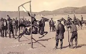 Смысл этой забавы заключался в следующем: живого гуся с хорошо смазанной жиром головой привязывали за ноги к горизонтальной жерди, располагавшейся на достаточно большой высоте и прикреплённой к двум вертикальным жердям, образовывавшим конструкцию наподобие ворот. Человек должен был проехать на лошади на полном скаку через эти «ворота» и суметь схватить гуся за голову, тем самым оторвав её[1]. Сделать это было достаточно сложно ввиду смазки на голове гуся и трепыханий птицы; иногда в состязаниях вводились дополнительные элементы сложности — например, около «ворот» иногда ставили человека с хлыстом, который его ударами должен был пугать подъезжающую лошадь. Призом за победу в состязании служил обычно сам гусь, иногда — небольшие денежные суммы, собранные со зрителей, или алкогольные напитки.