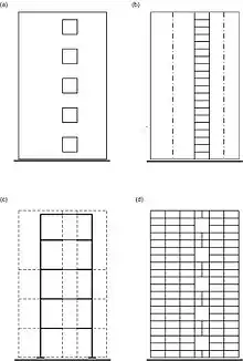 В дискретно-континуальных расчётных схемах неизвестные силовые факторы или перемещения задают в виде непрерывных функций вдоль одной из координатных осей. Неизвестные функции определяются решением краевой задачи для системы обыкновенных дифференциальных уравнений. Дискретно-континуальные расчётные схемы получили особо широкое применение в 1960—80 годах прошлого века для расчёта стен и вертикальных диафрагм жёсткости многоэтажных зданий с регулярным расположением проёмов, когда вычислительные возможности ЭВМ были весьма ограничены. Эти расчётные схемы основаны на теории составных стержней, которую в 1938—1948 гг. разработал А. Р. Ржаницын[4][5]. По-видимому, впервые теория составных стержней была использована в работе[6]. В дальнейшем R. Rosman, [7]. П. Ф. Дроздов[8], Д. М. Подольский[9] и другие авторы предложили для расчёта зданий повышенной этажности различные модификации теории составных стержней.