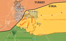Для противодействия боевикам в город были направлены дополнительные курдские отряды. Тем временем ССА, поддерживаемая Турцией, обвинила «Демократический союз» в связях с Рабочей партией Курдистана (PKK), действующей на территории Турции[12]. Попытки заключить устойчивое перемирие и объединить усилия против правительственных войск не увенчались успехом[13][14][15][16][17][18].