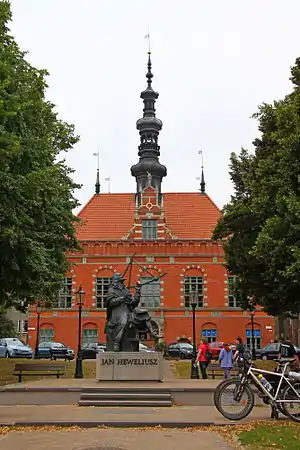 Ратуша была построена в 1587-1589 годах (отделочные работы были завершены в 1595 году) в стиле нидерландского маньеризма. Проект ратуши принадлежал нидерландскому архитектору Антони ван Оббергену, каменный портал же скорее всего создал Виллем ван дер Меер. Возведённая для нужд властей города, ратуша долгое время служила центром политической, социально-экономической и научной жизни Гданьска. Возле ратуши жил знаменитый польский астроном Ян Гевелий, служивший градоначальником в ней и бывший к тому же потомственным пивоваром.