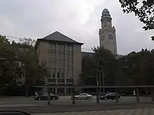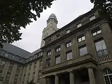Главной архитектурной доминантой ратуши служит башня высотой 63,72 м, на которую ведут 278 ступеней. Медная крыша башни (капот) — это типичный признак эпохи Вильгельма II. В здании оборудован пассажирский лифт непрерывного действия с кабинами без дверей (патерностер). В 1952—1953 годах к зданию было пристроено восточное крыло.