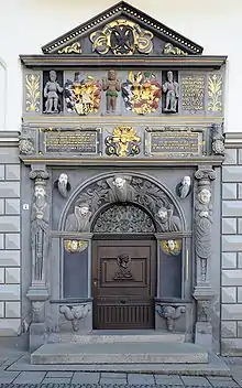 Среди гербов владетельных домов также находится и герб города, окруженный двумя надписями на латинском языке. Три мужские фигуры в арке интерпретируются как три бюргермейстера, управлявшие городом во время постройки портала. В те годы в Гере заседал совет трёх и бюргермейстер избирался каждый год. На резьбе на дверных створках изображена древнеримская богиня Юстиция со своими атрибутами: глазной повязкой, весами и обоюдоострым мечом. На правой стороне портала изображена мера герского локтя (0,572 м).