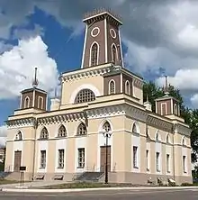 Каменное двухэтажное прямоугольное и центрическое здание, завершённое пятью деревянными четвериковыми башнями[1]; четыре из них расположены по углам основного объёма и увенчаны шпилями, пятая (более высокая и суженная вверху) — посередине на массивном четвериковом барабане[1]. Оконные проемы прямоугольные со стрельчатым арочным завершением. Карниз с фигурными кронштейнами. По бокам главного фасада два входа, к каждому входу ведёт монументальная каменная лестница.