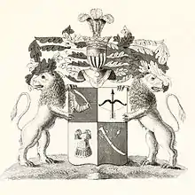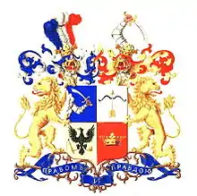 Над щитом два дворянских коронованных шлема. Нашлемник правого — три страусовых пера: среднее — серебряное, правое — лазоревое, левое — червлёное. Нашлемник левого — правая рука в серебряных латах держит серебряный изогнутый меч с золотой рукояткой. Намёт: справа лазоревый, подложен серебром, слева червлёный, подложен золотом. Щитодержатели: два золотых льва с червлёными глазами и языками. Девиз: «ПРАВОМ И ПРАВДОЮ» серебряными буквами на лазоревой ленте[5].