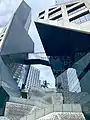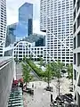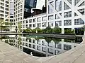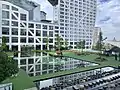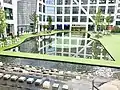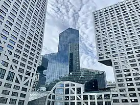 Подиум комплекса расположен на нескольких уровнях, между которыми проложены лестницы и переходы. Внутри комплекса создано общественное пространство с прогулочной зоной, скверами, фонтанами и прудами. Фасады зданий выполнены из белого бетона и стекла. Нижний уровень занимает шестиэтажный торговый центр и автомобильный паркинг[4][5].