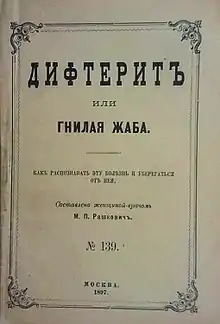 - Дифтерит или гнилая жаба: Как распознавать эту болезнь и уберегаться от неё / Сост. женщиной-врачом М. П. Рашкович. — М.: Посредник, 1897. — 27 с.