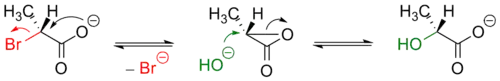 Несмотря на формальный (с точки зрения одностадийности) механизм SN2, образующийся в ходе реакции продукт имеет ту же оптическую конфигурацию, что и исходный.