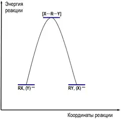 Условный энергетический профиль реакции бимолекулярного нуклеофильного замещения представлен на диаграмме[2].