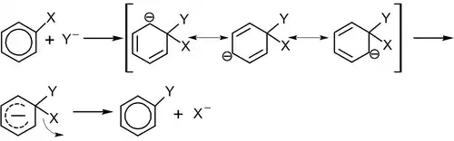 Механизм реакции SNAr или реакции ароматического нуклеофильного замещения (англ. substitution nucleophilic aromatic) является наиболее важным среди реакций нуклеофильного замещения ароматических соединений и состоит из двух стадий. На первом этапе происходит присоединение нуклеофила, на втором — отщепление нуклеофуга. Иначе механизм SNAr называют механизмом присоединения-отщепления: