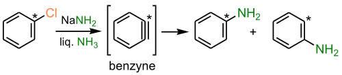 При взаимодействии арилгалогенидов, не содержащих заместителей, с сильными основаниями (например: NaNH2) замещение идёт по ариновому механизму — через стадию образования дегидробензола: