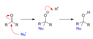 Реакции нуклеофильного присоединения по связи С=С довольно редки, наибольшее распространение и практическое значение имеет присоединение по связи С=O[2]: