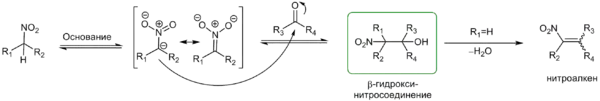 Стадия нуклеофильного присоединения катализируется основаниями и, в случае наличия кислого протона в альфа-положении, может сопровождаться элиминированием воды. Основными продуктами реакции Анри являются бета-гидроксинитросоединения, побочными — нитроалкены (особенно в случае использования ароматических альдегидов).