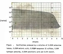 Исходный водный раствор содержит перекись водорода, иодат, двухвалентный марганец (Mn2+) в качестве катализатора, сильная инертная кислота (серная (H2SO4 ) или хлорная (HClO4) кислота) и органическое соединение с активным («енольным») атомом водорода, соединенным с углеродом, который будет медленно восстанавливать свободный иод (I2) до иодида (I-).
