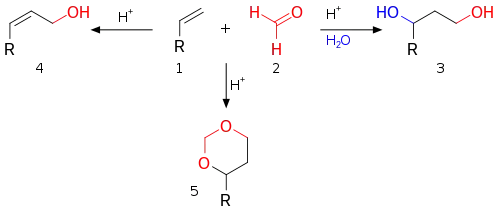В классическом варианте реакции в качестве карбонильного компонента используется формальдегид 2 и основным продуктом реакции являются 1,3-диолы 3, реакцйия проводится в ледяной уксускной кислоте при катализе серной кислотой[1], именно в этом варианте она описана наиболее широко.