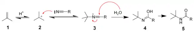На последней стадии нитрилиевая соль реагирует с водой, образуя таутомер амида 4, изомеризующийся далее в N-замещенный амид 5: