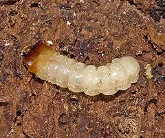 Спустя 14—20 дней из яиц появляются личинки, которые вбуравливаются в кору, прокладывают там ходы, забивают их буровой мукой. При этом они разрушают луб, не задевая заболони. Личинки зимуют. После зимовки личинки снова продолжают делать ходы, которые принимают извилистую или площадковидную форму. В конце лета и в начале июля личинки в конце хода строят колыбельку, чуть углубляя её в верхнем слое древесины, по бокам обкладывают крупной волокнистой буровой мукой и окукливаются. Длина колыбельки от 20 до 25 мм, и шириной 15—16 мм. Толщина слоя буровой муки вокруг колыбельки варьируется от 5 до 18 мм[7].