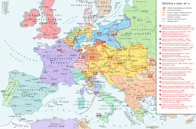Европейские революции 1848—1849 («Весна народов») — общее наименование революционных событий, выразившихся в форме неповиновения власти, вооружённых восстаний, декларирования новой государственности в европейских странах в середине XIX века. Вспыхнувшие сразу в нескольких государствах движения носили антифеодальный и национально-освободительный характер. Участники выступлений декларировали требования демократизации общественной жизни.