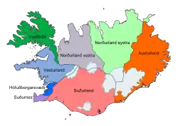 Деление Исландии на регионы не входит в официальную систему административно-территориального деления Исландии, так как по закону в стране всего два уровня деления: национальное правительство и общины. В 2014 году, после административной реформы и упразднения сисл, общины Исландии в соответствии со статьёй 97 Закона о местном самоуправлении № 138/2011. объединились в восемь региональных ассоциаций общин[1], работающих в общих интересах всех общин в каждой ассоциации. Эти ассоциаций общин были признаны[2] Статистическим управлением Исландии регионами для представления статистических данных.[3]