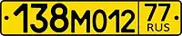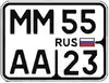 ![]() | Тип 20 — Регистрационные знаки легковых, грузовых автомобилей и автобусов. Тип 21 — Регистрационные знаки для автомобильных прицепов и полуприцепов. Тип 22 — Регистрационные знаки для мотоциклов, внедорожных мототранспортных средств. Были официально утверждены и введены 1 марта 2002 года, выполняются белыми символами на синем фоне. Форматы: буква — 4 цифры для автомобилей, три цифры — буква для прицепов, четыре цифры сверху / буква снизу для мотоциклов. Цифровой код, указывающийся в правой части номерного знака, так же, как и на большинстве других номеров РФ, обозначает регион регистрации. Исключение: код 77, указывающий на принадлежность транспортного средства к МВД России (своеобразный «федеральный» номер МВД). |