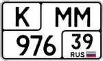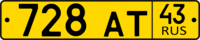 | Тип 19 — Для легковых и грузовых автомобилей, автобусов, автомобильных прицепов и полуприцепов, окончательно выезжающих за пределы Российской Федерации, а также для иных случаев, определяемых Министерством внутренних дел Российской Федерации. Введены 1 марта 2002 года. Данные номерные знаки устанавливаются на автомобили, экспортируемые из Российской Федерации. До введения новых номерных знаков группы 6, их отличительной особенностью являлось наличие в отдельном окне в левой части буквы Т. Формат знака: 2 буквы — 3 цифры. Новый ГОСТ предписывает изображение государственного флага РФ после надписи RUS. | |