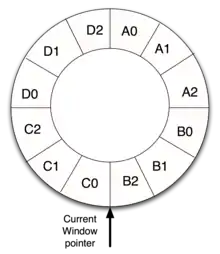Указатель на начало текущего регистрового окна хранится в специальном регистре CWP (Current Window Pointer — указатель текущего окна) и изменяется аппаратно.[3]