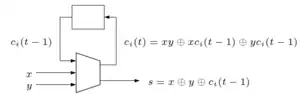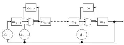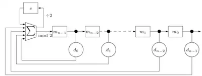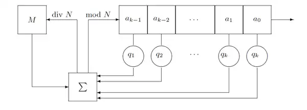 Вместо выполнения операции XOR над всеми битами отводной последовательности эти биты складываются друг с другом и с содержимым регистра переноса. Результат и становится новым битом. Результат, деленный на , становится новым содержимым регистра переноса.[3]