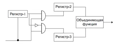 Данная схема представляет собой улучшенную версию генератора «стоп-пошёл». Он состоит из последовательности регистров, тактирование каждого из которых управляется предыдущим регистром. Если выходом Регистра-1 в момент времени является 1,то тактируется Регистр-2. Если выходом Регистра-2 в момент времени является 1, то тактируется Регистр-3, и так далее. Выход последнего регистра является выходом генератора.[3]