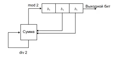 - Генератор «стоп-пошел» FCSR/LFSR : Регистр-1 — FCSR; Регистр-2, Регистр-3 — LFSR. Объединяющая функция — сложение с переносом.