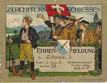 В Швейцарии сильная оружейная культура по сравнению с другими странами мира.[35][36] В 2016 году Swiss Olympic провела исследование клубов и членов в Швейцарии: Швейцарская федерация спортивной стрельбы занимает 2-е место по количеству клубов и 9-е место по количеству членов клуба.[37] Членами Федерации являются стрелки, которым необходима лицензия для участия в соревнованиях, те, кому она не нужна, вероятно, не будут ее членами, поскольку в ней нет необходимости. Такие группы, как ProTell, лоббируют защиту прав Швейцарии на оружие. Кроме того, Schweizerischer Schützenverein, швейцарская ассоциация стрелков, каждые пять лет проводит Eidgenössische Schützenfeste, а Eidgenössisches Feldschiessen проводится ежегодно. Каждый человек со швейцарским гражданством в возрасте 10 лет и старше может принять участие в любых федеральных стрельбищах и бесплатно стрелять из артиллерийской винтовки.[38]