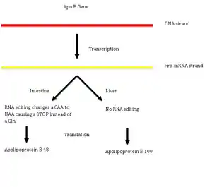 Под действием фермента цитидиндезаминазы происходит реакция дезаминирования, превращающая цитидин в урацил. Редактирование C → U может быть рассмотрено на примере гена аполипопротеина B у человека. В печени экспрессируется его изоформа Apo B100, а в кишечнике — apo B48. В клетках кишечника мРНК аполипопротеина B подвергается C → U редактированию, из-за которого кодон CAA превращается в стоп-кодон UAA, и синтезируется изоформа apo B48. Редактирование C → U часто происходит в митохондриальных РНК цветковых растений. У разных растений интенсивность редактирования C → U варьирует: у мха Funaria hygrometrica в митохондриальных РНК происходит восемь актов редактирования, а у плауна Isoetes engelmannii — около 1700[11]. Превращение C → U осуществляется семейством белков с пентатрикопептидными повторами (англ. pentatricopeptide repeat, PPR). Это семейство богато представлено у цветковых растений: так, у Arabidopsis насчитывается 450 белков этого семейства. Белки PPR были описаны также в пластидах и митохондриях[12].