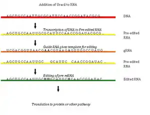 Редактирование РНК путём встраивания или удаления урацилов было описано в митохондриях кинетопластид Trypanosoma brucei[3][4][5][6][7][8][9][10]. Редактирование РНК начинается со спаривания первичного нередактированного транскрипта с направляющей (гидовой) РНК, которая содержит комплементарные последовательности около сайтов встраивания или удаления. Образующийся двуцепочечный участок далее покрывается эдитосомой — крупным многобелковым комплексом, катализирующим редактирование РНК[4][5]. Эдитосома начинает встраивание уридинов по первому положению неспаренных нуклеотидов. Встраиваемые уридины образуют комплементарные связи с направляющей РНК, и встраивание продолжается, пока в направляющей РНК встречаются A или G, и останавливается при появлении C или U[6][7]. Встраиваемые нуклеотиды вызывают сдвиг рамки считывания и приводят к тому, что транслируемый белок отличается от кодирующей области гена.