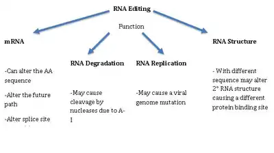 Редактирование РНК может выполнять несколько функций. В частности, оно может быть связано с деградацией РНК. В 2008 году было показано, что ADAR и UPF1 (фермент, участвующий в нонсенс-опосредованном распаде) взаимодействуют друг с другом и со сплайсосомой, формируя супрасплайсосому, и могут подавлять экспрессию некоторых генов. Подобно альтернативному сплайсингу, редактирование РНК может приводить к появлению новых форм белков за счёт замен, а также появления или удаления сайтов сплайсинга. Редактирование некодирующих РНК может изменить их структуру или привести к новым мутациям в вирусных геномах. Редактирование РНК может также представлять собой механизм защиты от ретротранспозонов[45].