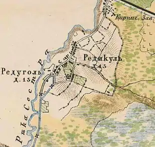 РЕДАКЮЛЬ (РЕДИКУЛЬ, РЕДУГОЛЬ) — деревня владельческая, при р. Сестре, 14 дворов, 38 м. п., 52 ж. п.;(1862 год)[6]