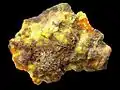 Резерфордин (тёмно-бежевый), биллитит (оранжевый) и уранофан (жёлтый) из шахты Шинколобве, Катанга, Демократическая Республика Конго (размеры: 2.5×2.0×0.7 см)
