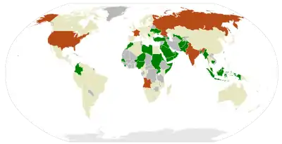 Азербайджан, Афганистан, Бангладеш, Бахрейн, Бруней, Гамбия, Грузия, Джибути, Индонезия, Иордания, Ирак, Йемен, Камбоджа, Катар, Колумбия, Коморские Острова, Кувейт, Ливия, Малайзия, Мальдивские Острова, Марокко, Молдавия, Мьянма, Нигер, Нигерия, Объединённые Арабские Эмираты, Оман, Пакистан, Саудовская Аравия, Сенегал, Сербия, Сомали, Судан, Сьерра-Леоне, Тувалу, Турция, Уганда, Узбекистан, Украина[5].