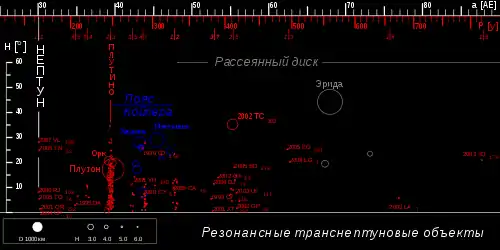 На диаграмме указано расположение известных транснептуновых объектов (с большой полуосью до 70 а. е.), относительно орбит планет и кентавров. Резонансные объекты отмечены красным цветом. Орбитальные резонансы с Нептуном отмечены вертикальными линиями; 1:1 — орбита Нептуна и его Троянских астероидов, 2:3 — Плутино (включая Плутон), остальные линии указывают на менее многочисленные резонансные объекты.