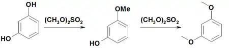 Резорцин обладает свойствами фенолов. С щелочами образует соли — феноляты, с диметилсульфатом даёт монометиловый эфир резорцина и диметиловый эфир резорцина[3].