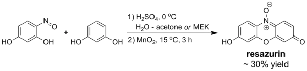 При действии азотистой кислоты на резорцин образуется 4-нитрозорезорцин, который конденсируется при окислении с резорцином с образованием резазурина[5]: