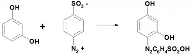 Резорцин легко вступает в реакции азосочетания, например с диазотированной сульфаниловой кислотой дает краситель резорциновый жёлтый.