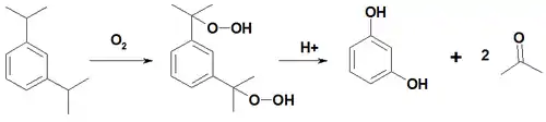 Также его получают окислением 1,3-диизопропилбензола кислородом воздуха с последующим кислотным гидролизом образующегося бисгидропероксида до резорцина и ацетона.