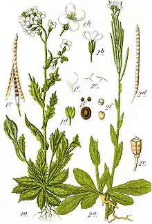 Ботаническая иллюстрация Якоба Штурма из книги Deutschlands Flora in Abbildungen, 1796: 1. Резуха альпийская (Arabis alpina),