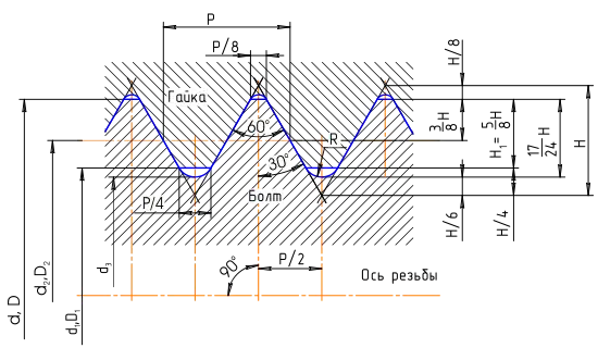 - Высота исходного треугольника резьбы () — расстояние между вершиной и основанием исходного треугольника резьбы в направлении, перпендикулярном к оси резьбы.